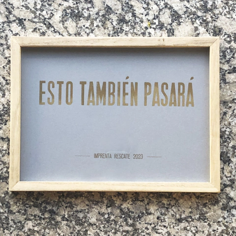 Afiche de 30,5x21 cm impreso con tipos móviles de madera y de plomo en tinta dorada sobre cartulina gris de 240 g/m2 a partir de la leyenda del anillo del rey.