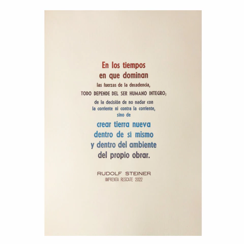 Afiche impreso con tipos móviles de plomo en tinta roja y celeste, sobre papel acanalado de 100 g/m2